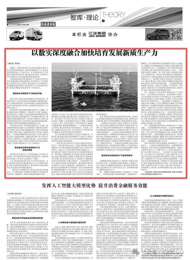 三、数实融合形成新质生产力的实践路径 为确保数实融合在新质生产力的形成与发展中发挥更大作用,需进一步强化数字基础设施建设,完善数字产业生态体系,发挥数据要素驱动效应,提升数字政府治理效能,通过数字经济与实体经济全方位、多领域深度融合,助推形成新质生产力。