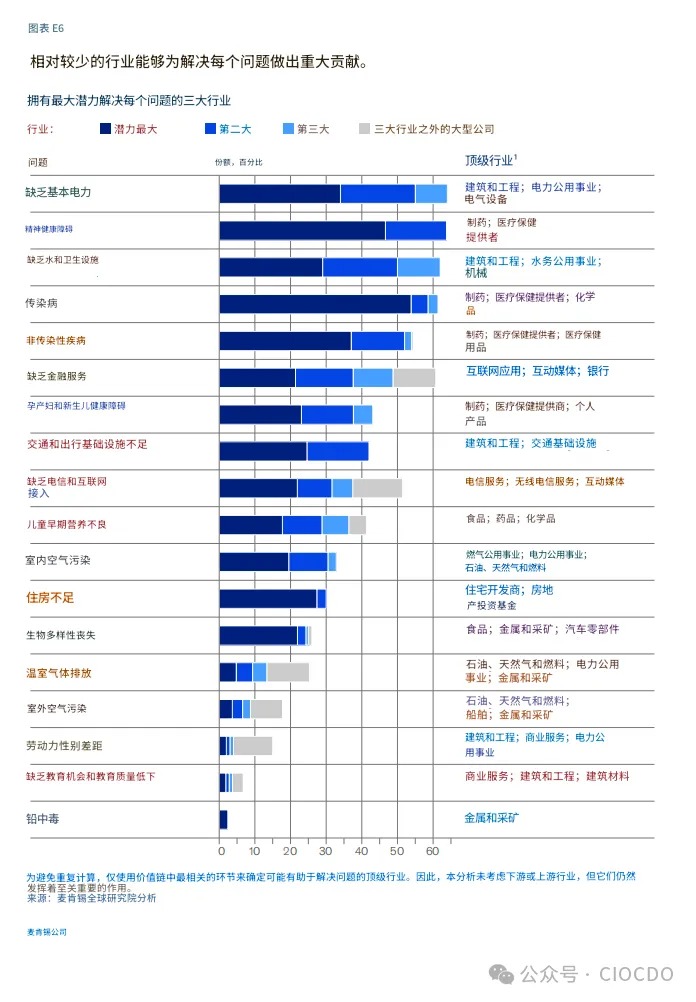 高度专业化:解决任何一个社会议题,其能力都高度集中在少数几个行业。例如,解决“基本电力普及”问题,建筑工程、电力和电气设备行业能贡献绝大部分力量。