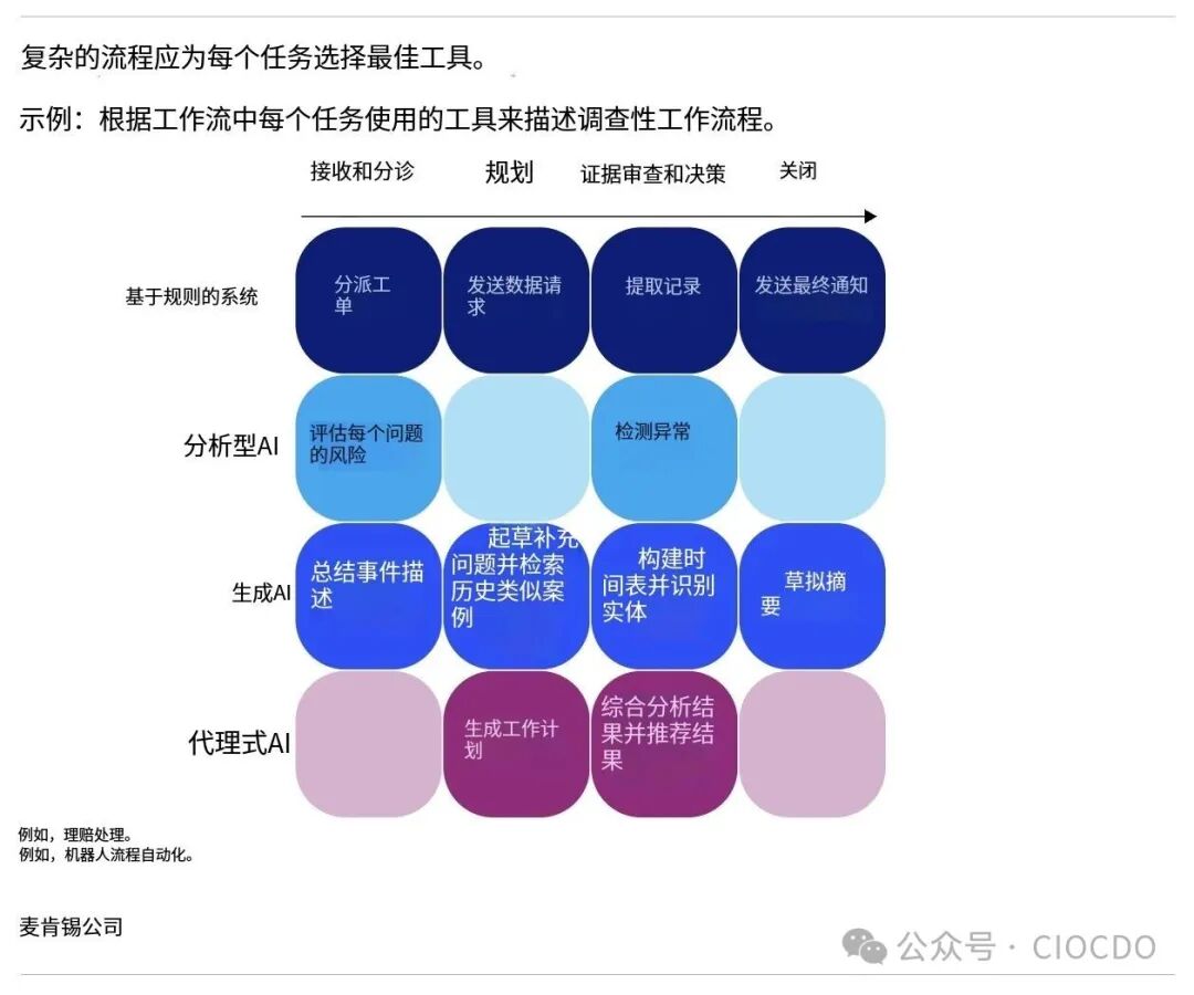 在许多场景下,混合使用多种技术可能是最优解。例如,保险公司的理赔流程,可以通过一个统一的编排框架,将基于规则的系统(用于初步筛选)、分析型AI(用于风险评分)、生成式AI(用于生成理赔报告初稿)和AI智能体(用于协调各系统、处理复杂查询)有机地结合起来。在这种模式下,智能体扮演的是“编排者”和“集成者”的角色,是统一工作流、减少人工干预的“粘合剂”。
