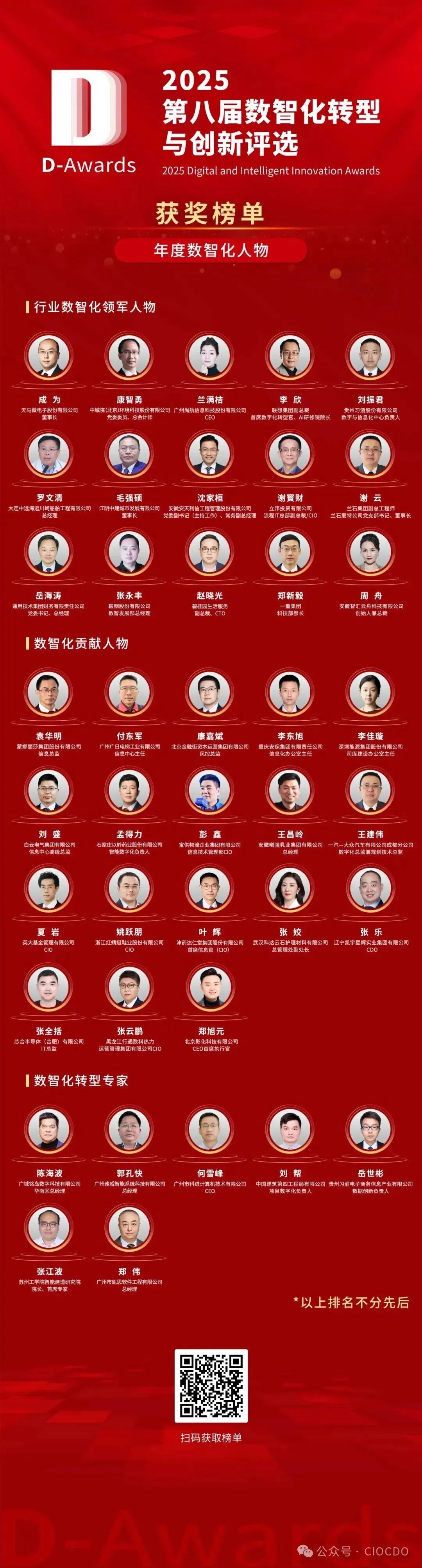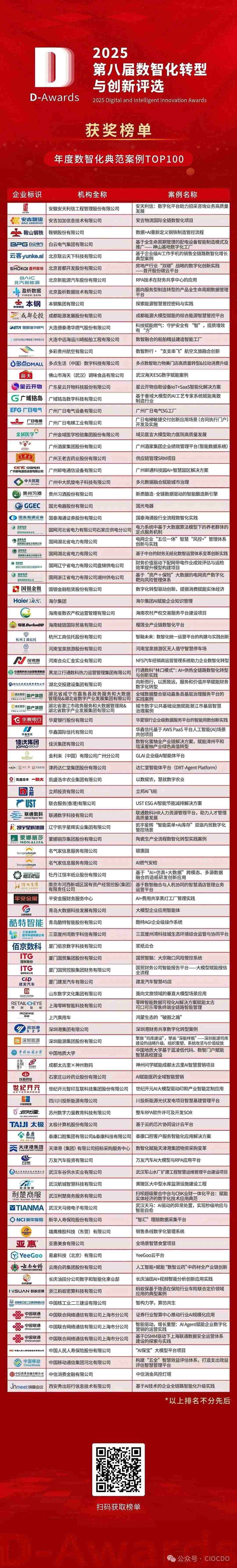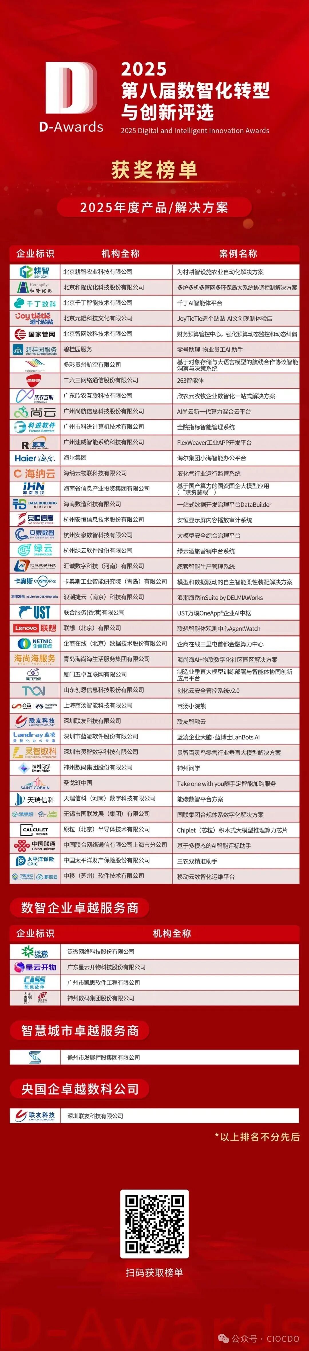 11月27日,“2025第八届数智化转型与创新评选”颁奖典礼于北京成功举办,数百家获奖企业代表与业界精英共襄盛举,共同见证数智化转型的辉煌成果,并正式揭晓了获奖榜单! 图1:嘉宾合影 在此次颁奖典礼上,山西大学自动化与软件学院副院长郭威,中国海洋大学管理学院教授、博士王舰分别发表致辞。随后,数字产业创新研究中心秘书长、锦囊专家创始人李圆介绍了本届评选活动的整体情况,并重磅发布《2025中国企业数智化转型案例研究报告》。 作为中国首个全面覆盖数字化产业和产业数字化发展的评选活动,“数智化转型与创新评选”由数字产业创新研究中心、锦囊专家、首席数字官联合全国30多家CIO组织机构、行业协会共同发起,已连续成功举办八届,累计参评企业超过1万家,涉及1.1万余个项目,50个领域。回顾八届评选的发展轨迹,我们能清晰看到中国企业数智化转型的蓬勃态势:从 2018 年 600 余家参评企业、18 个细分奖项,到 2025 年参评企业超 1900 家、细分奖项增至 69 个。参评规模的持续扩大、覆盖范围的不断延伸、奖项设置的逐步细化,不仅体现了评选的行业影响力逐年提升,更印证了数智化转型已从“可选”变为“必选”,成为全行业的共识与行动。 “2025第八届数智化转型与创新评选”自5月正式启动,历时近半年,以“公平、公正、公开”为原则,以“成熟度、创新性、应用成效、难度和复杂性、推广性”综合制定评审标准,由29位数字化领域知名专家学者,对入围企业进行多维度的评审和考核,并综合公众投票的结果,最终有159家企业和个人脱颖而出,荣膺各项大奖。 本届评选活动以中国数字企业模型与指标体系、智慧城市评价指标体系2.0为理论指导,面向企事业单位、政府,设置了案例组、产品组和人物组三大组别的69个细分奖项,参与企业数目超过1900家。经过严格的四轮评审,最终产生了100个标杆案例、一批创新产品和40位数字化先锋人物。他们来自全国21个省份、13个主要行业,充分体现了数智化转型的广度与深度。其中,案例组获奖企业以信息技术服务业、制造业相对居多,企业类型以国有企业和民营企业为主。产品组获奖企业涉及AI+安全、AI大数据融合、AI基础设施、AI协同办公、AI智能体、云计算等6大创新产品,制造、教育、金融、零售、能源、农业等9大行业,以及采购、研发、营销、服务等4大场景。人物组获奖者主要为大中型企业CEO、CIO等数智化转型决策者。 图2:评委会专家致辞 图3:福建省职业经理人协会副会长兼CIO与CDO专委会主任、福建CIO网创始人 谢磊为年度数智化典范案例获奖嘉宾颁奖 图4:年度数智化典范案例颁奖嘉宾与获奖嘉宾合影 以下为本届完整获奖榜单,恭喜所有获奖者!“2026第九届数智化转型与创新评选”预计将于2026年6月正式启动,欢迎数字化领域的各界组织机构及相关人士,一起凝聚数字化力量,助力中国数字经济创新发展。