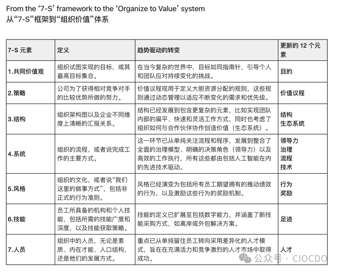 图表说明:该表格对比了传统的 7-S 元素与更新后的 12 个元素,并解释了趋势驱动的转变。