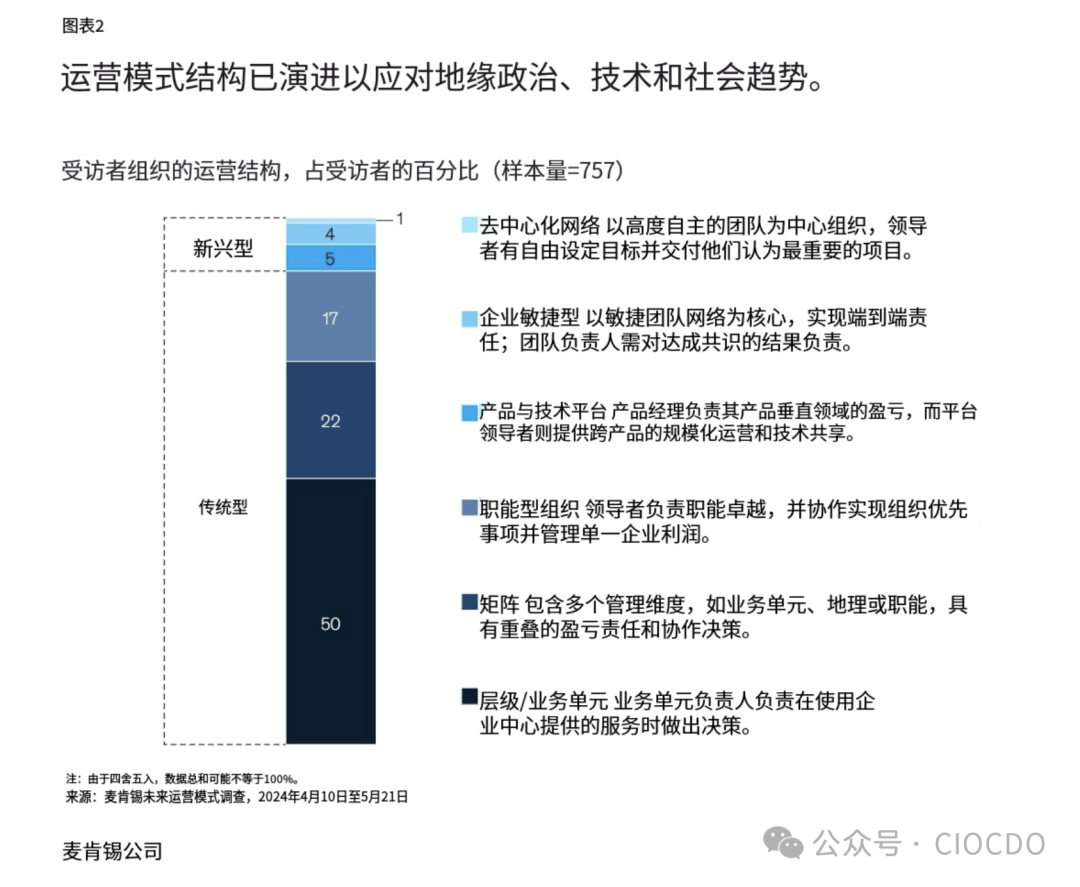 标题:运营模式结构已演变以应对地缘政治、技术和社会趋势。 内容描述:显示受访者组织的运营结构分布。