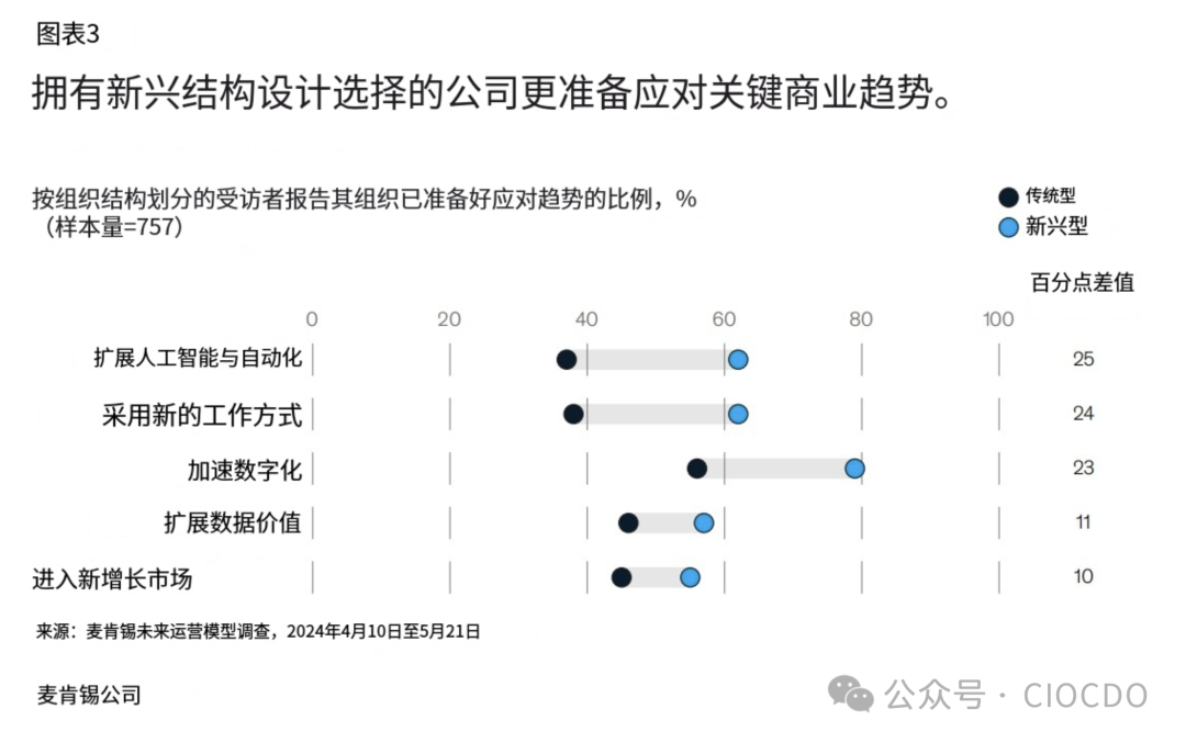 标题:采用新兴结构设计的公司在应对关键业务趋势方面准备更充分。 内容描述:对比了“新兴结构”与“传统结构”在应对趋势上的准备度差距(百分点差值)。