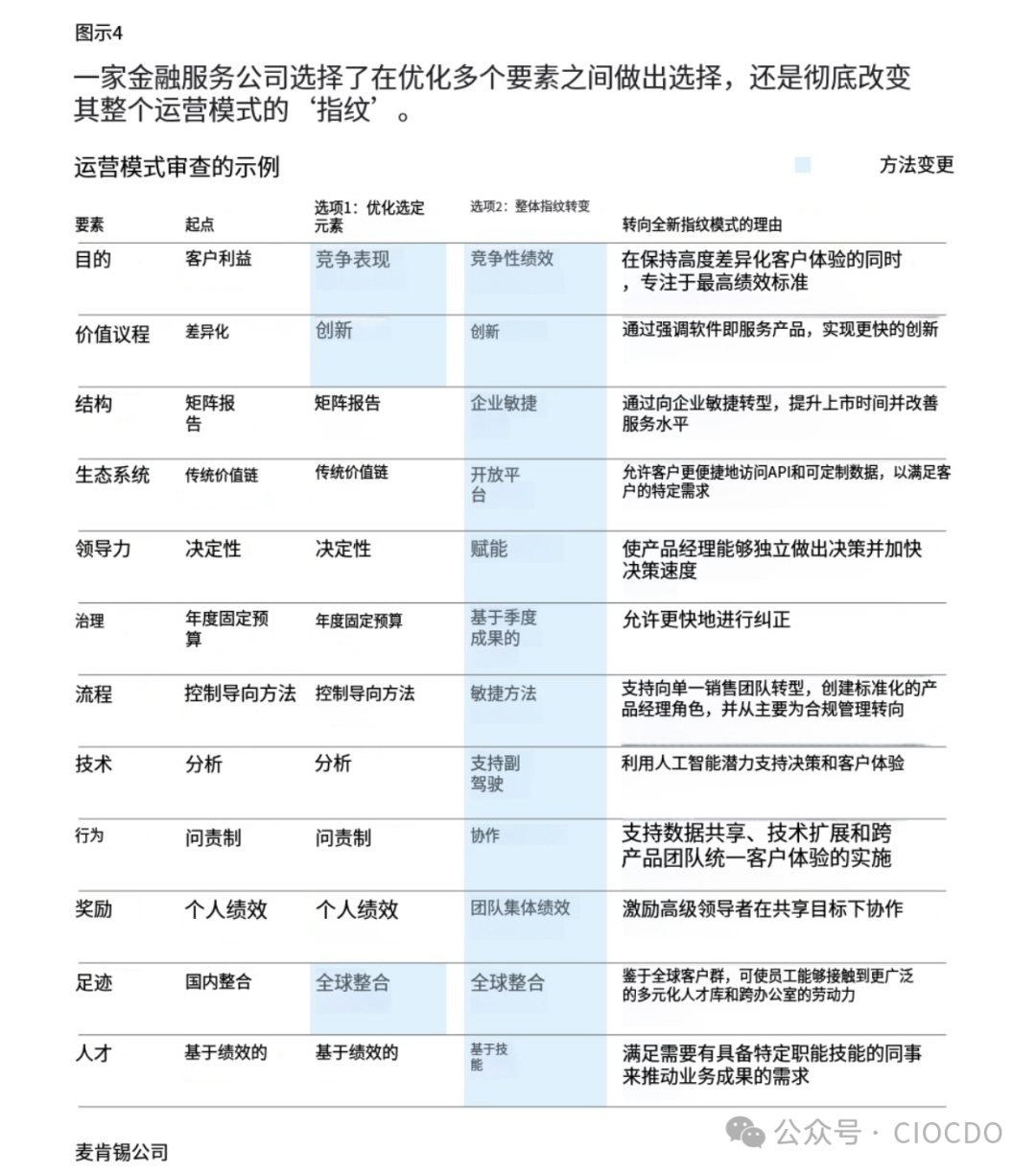 虽然选项一在短期内风险较低,因为它主要侧重于释放成本并将其再投资于创新,但团队决定选择选项二,转向基于企业敏捷结构的全新指纹 。其思路是,显著更高的价值足以弥补所需变革的广度和深度 。