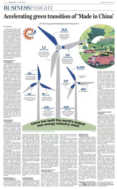 强化绿色理念引领。理念是行动的先导,中国制造绿色转型的深层动力正是源于习近平生态文明思想,“绿水青山就是金山银山”理念的提出,是对传统工业发展范式的超越,引领中国走上了高质量发展与高水平保护并举之路。在科学理念指引下,中国构建了碳达峰碳中和“1+N”政策体系,将碳达峰碳中和这一宏伟目标转化为可落地、可衡量的具体行动,通过绿色标准、绿色金融、碳交易市场等政策工具,为绿色低碳转型创造稳定且可预期的市场环境。近年来,中国的经济发展对能源的依赖度逐步降低。2021—2024年,中国以年均3%左右的能源消费增速支撑了年均5%以上的工业经济增长。绿色转型催生出强大的新经济动能,中国建成了全球最大新能源产业链,2024年,中国风光发电总装机超过12亿千瓦,提前6年完成国家自主贡献提出的2030年装机目标,全球超过一半的电动汽车在中国道路上行驶。