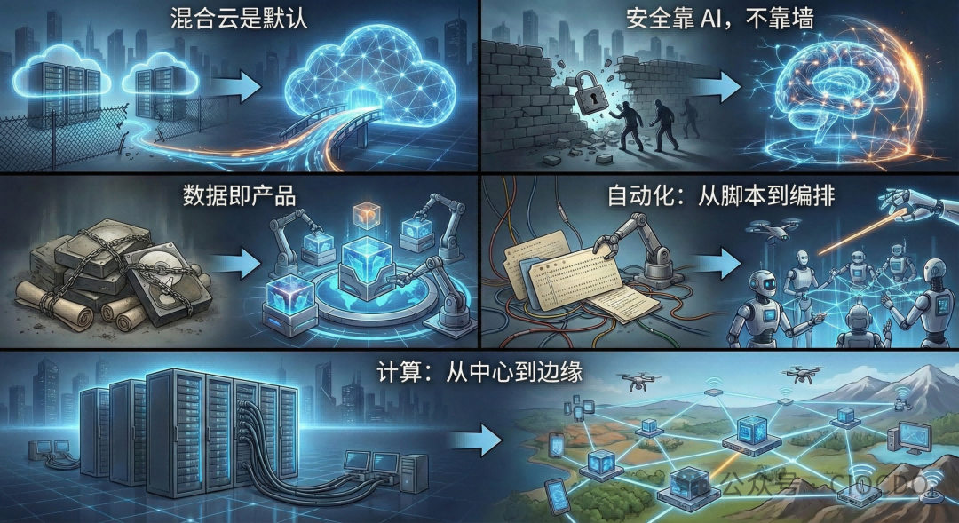 核心摘要:在 2026 年,IT 的游戏规则已经改变。混合云不再是选项而是默认,安全不再靠“墙”而靠 AI,数据不再是负担而是产品,自动化从脚本进化为智能编排,计算力从中心下沉到边缘。对于 CIO 而言,掌握这 5 大转变是构建韧性与竞争力的关键。