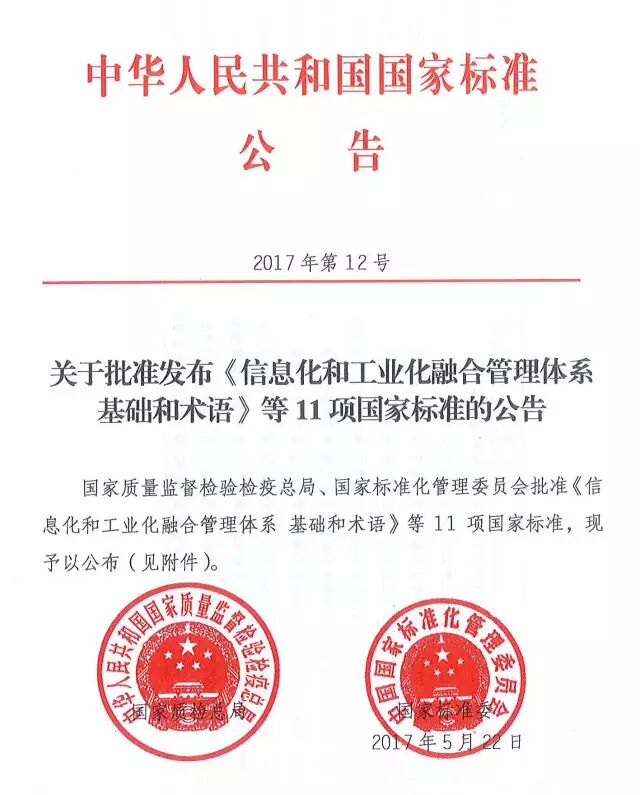 2017年6月7日,信息化和工业化融合管理体系国家标准发布会在北京召开,正式发布GB/T 23000-2017《信息化和工业化融合管理体系 基础和术语》和GB/T 23001-2017《信息化和工业化融合管理体系 要求》两项国家标准。工业和信息化部总工程师张峰,国家标准化管理委员会主任田世宏出席会议并讲话。发布会由工业和信息化部办公厅副主任黎烈军主持,国家标准化管理委员会副主任殷明汉在会上宣读了2017年第12号中国国家标准公告,工业和信息化部信息化和软件服务业司司长谢少锋对两项标准进行了解读。工业和信息化部科技司、信软司、中小企业局、国际司,国家标准化管理委员会工业二部等两化融合管理体系工作领导小组成员单位代表出席会议。