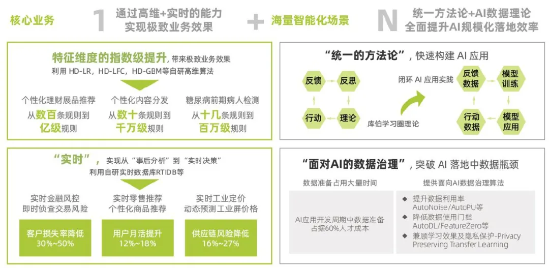 “1”指极致的核心场景。每个企业都有1个或多个核心业务,企业的业务一定是和企业的发展目标相关的。这些业务提升会带动整个企业的提升。面对这些核心业务场景,我们需要将智能化做到“极致的效果”,因为这些领域每提升一个百分点的效果,对企业都至关重要。