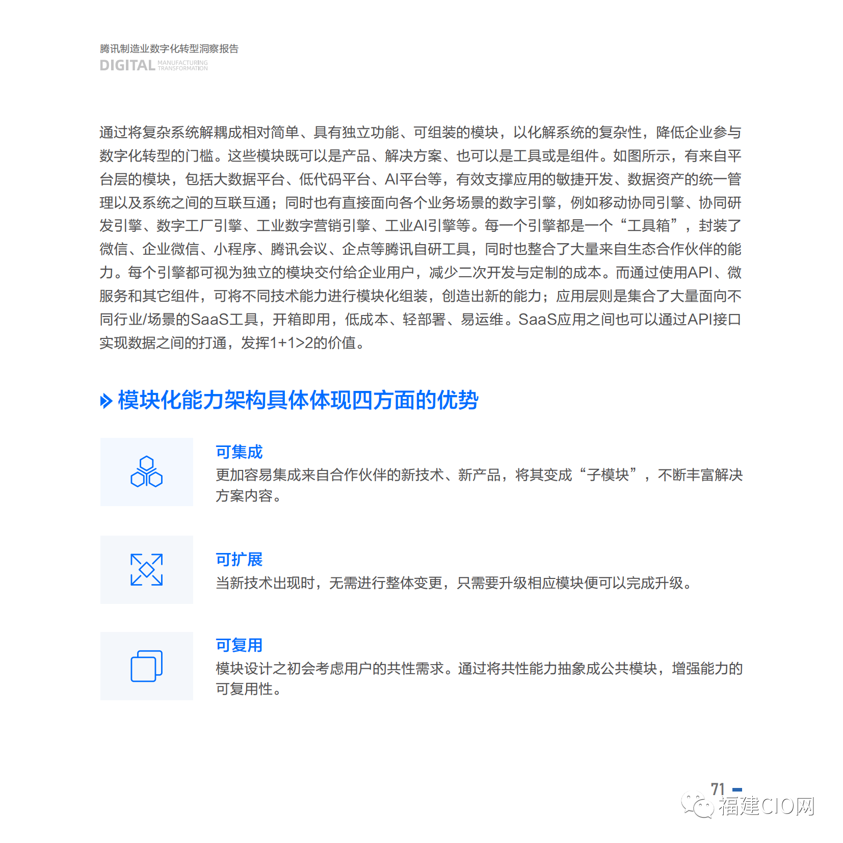 如果说工业时代,企业依赖中央电厂提供的电力来保障生产运营,那么数字经济时代,众多平台型工业企业同样会依托第三方提供的、统一的基础数字技术能力来构建自身的数字底座 。通过“外包”方式,更好聚焦在自身的业务创新与服务体验上。腾讯则是扮演好“中央电厂”或是“平台的平台”这一角色。通过做厚底座(计算平台、PaaS平台 ),增强底座的适配性、灵活性与可扩展性,更好与平台型企业的能力相补充。截至目前,腾讯云已帮助包括腾讯WeMake、工业富联、树根与联、忽米网在内的多家国家级双跨平台构建了数字底座。我们看到,当前越来越多细分领域的领军企业、骨干企业也纷纷着手平台化布局。通过将自身资源与能力以平台化方式反哺,形成行业级、产业级或是区域级工业互联网平台。而跳过“自建电场”的深坑,共用统一的数字底座已经在业内达成共识。